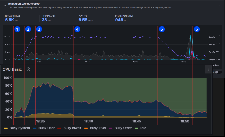 - Stage 2 berakhir dan stage 3 dimulai. Volume request stabil di 6 RPS. Sistem mengalami lebih dari 70% CPU Load. Scale up diinisiasi.